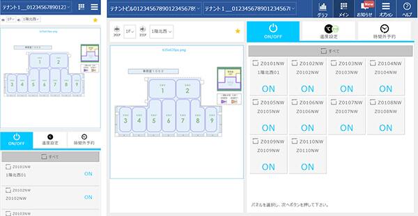 テナント操作として、空調/照明のON/OFF,温度設定、時間外運転の予約の機能を備えています。 また、テナントと建物管理者の円滑なコミュニケーション促進のため、「簡易エネルギー表示」、「テナントへのお知らせ表示」、「建物管理者への連絡」の機能をご提供します。