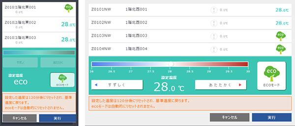 PC,タブレット、スマートフォンといった各種モバイル端末から操作可能なため、いつでも、どこからでも空調/照明の操作、建物管理者への依頼を行うことができ、居室環境を快適にすることができます。また、テナント単位でエネルギー使用量を見える化できるため、入居テナントの省エネ、エコ活動を支援します |
