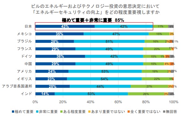 エネルギー価格の高騰を背景に、エネルギーセキュリティへの関心が世界的に高まる中、日本の回答者の85%がビルのエネルギーおよびテクノロジー投資の意思決定においてエネルギーセキュリティの向上が「極めて」または「非常に」重要と回答しました。この回答率の高さは調査国中トップであり、非常に高い関心が寄せられていることが浮き彫りとなりました。