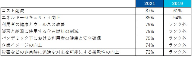 さらにビルのエネルギーおよびテクノロジー投資原動力のトップ5のうち、日本の上位2項目は2019年の調査*1時と変わらず「コスト削減」と「エネルギーセキュリティ向上」であるものの、その重要度合はそれぞれ61%から87%、54%から85%へと大幅に上昇、エネルギー効率とセキュリティ向上への旺盛な投資意欲が表れる結果となりました。3位以下には新たに「利用者の健康とウェルネス改善」、「暖房と給湯に使用する化石燃料の削減」、「パンデミック下における利用者の健康と安全確保」がランクインしました。