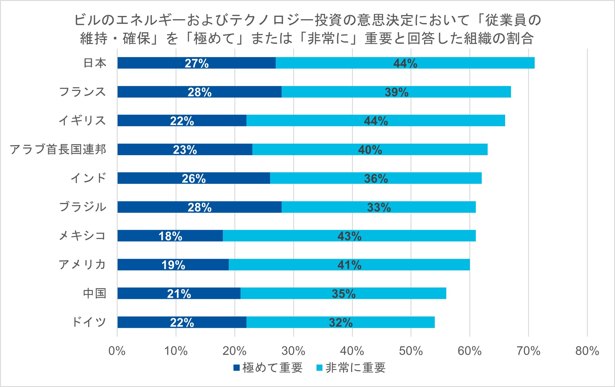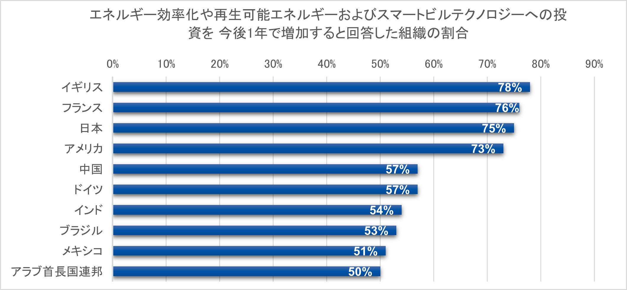 2019年調査と同じく、日本の回答者の75%が省エネ、再エネ、スマートビルテクノロジーへの投資を増加すると回答。これは、イギリス(78%)、フランス(76%)に次いで高く、調査国中第3位となりました。