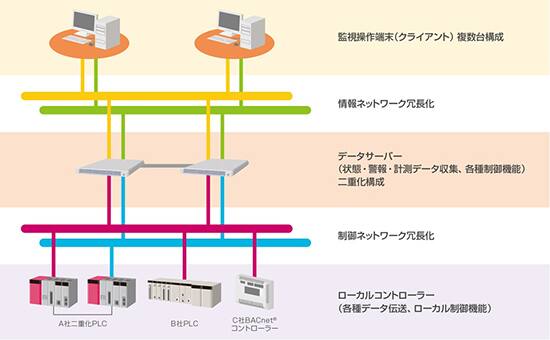 データセンターや地域冷暖房施設などの設備監視制御に要求される高信頼のBAS・BEMSをご提供します。 冗長化システムにおいては各種警報や計測値管理をつかさどるデータサーバーを二重化し、プライマリーサーバーの障害時にも自動的にセカンダリー サーバーがその機能を受け持ちます。主なローカルコントローラーとして採用するPLC(プログラマブル・ロジック・コントローラー)の二重化やネットワークの冗長化にも対応。 より信頼性の高いシステムをご提供できます。