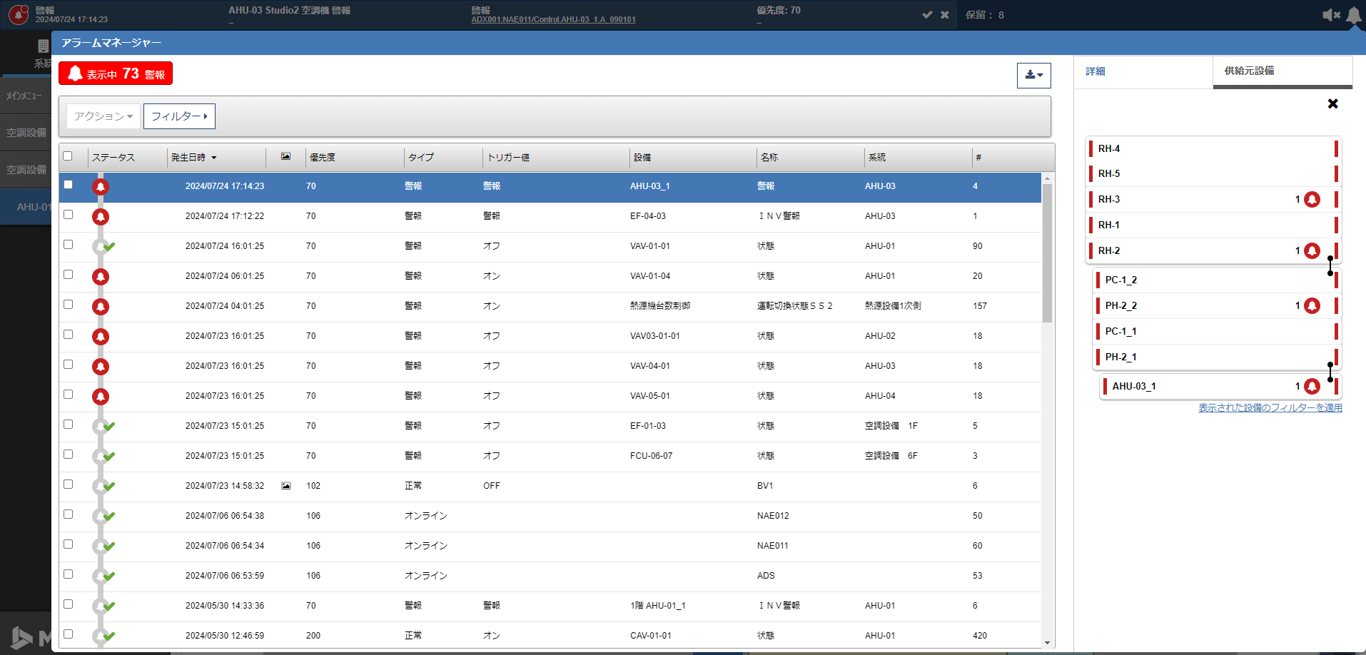MetasysビルオートメーションシステムRelease 13.0は、警報通知バーを新たに実装、画面を遷移しても常に上部に通知バーとして表示することで見落としを防ぎます。さらに、警報履歴機能(アラームマネジャー)では、同じ設備機器で警報が繰り返し発生した場合、最新の発生時系列ごとに異常を検知した設備を一覧で表示し、ワンクリックで過去の警報発生時刻の詳細を確認できるなど、きめ細やかで迅速なトラブルシューティングを可能にするUIを搭載しています。