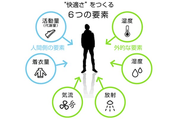 "快適さ"を測る方法にはPMV(=Predicted Mean Vote)があり、温度、湿度、放射、気流、活動量、着衣量の6つの要素から算出されるよ。